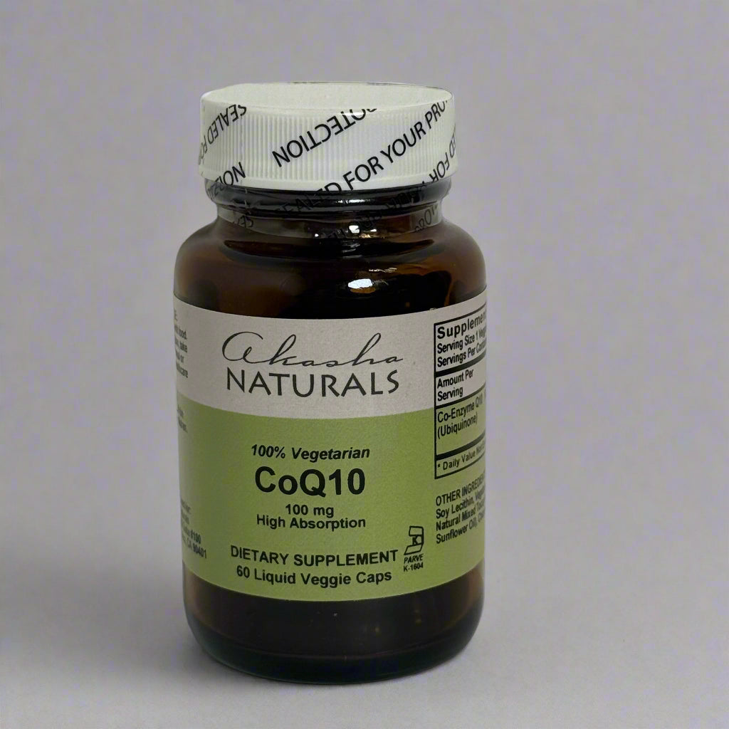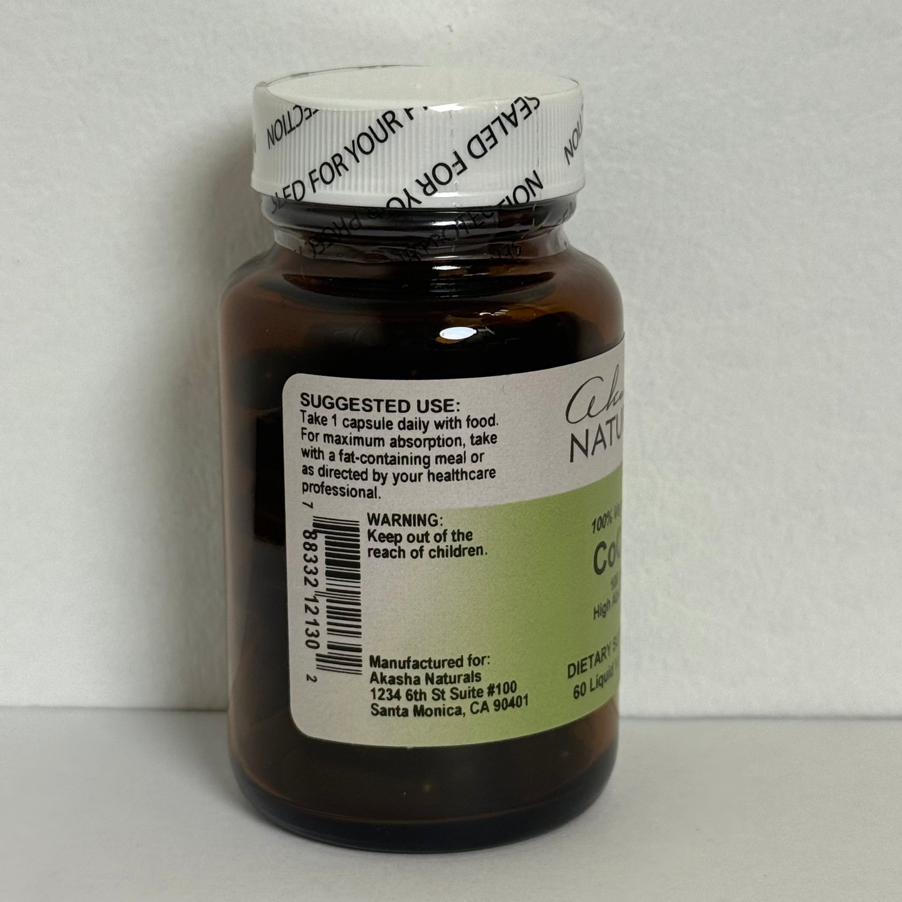 CoQ10 - 60 Veggie Caps from Akasha Naturals provides 100mg of ubiquinone (coenzyme Q10) per vegetarian softgel, suspended in a coconut oil base for optimal absorption. This formula is enhanced with 30 IU of mixed tocopherol vitamin E to help maintain the stability of this sensitive nutrient.