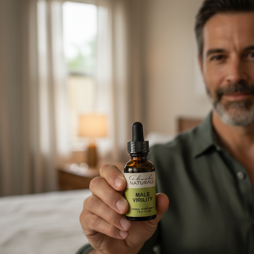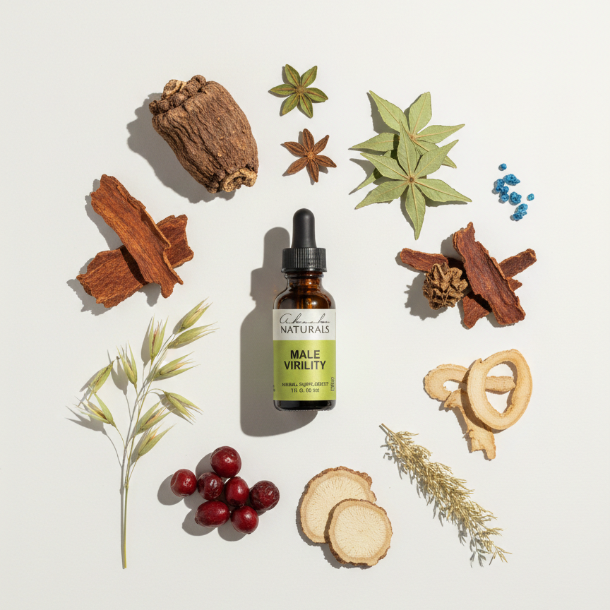 Male Virility is a concentrated herbal tincture featuring a proprietary blend of traditional botanicals known for their historical use in men's wellness. This 1-ounce liquid formula combines maca root, yohimbe bark, epimedium herb, tribulus seed, wild oat seed, saw palmetto berry, and American ginseng root in an alcohol-based extract for optimal phytochemical preservation.