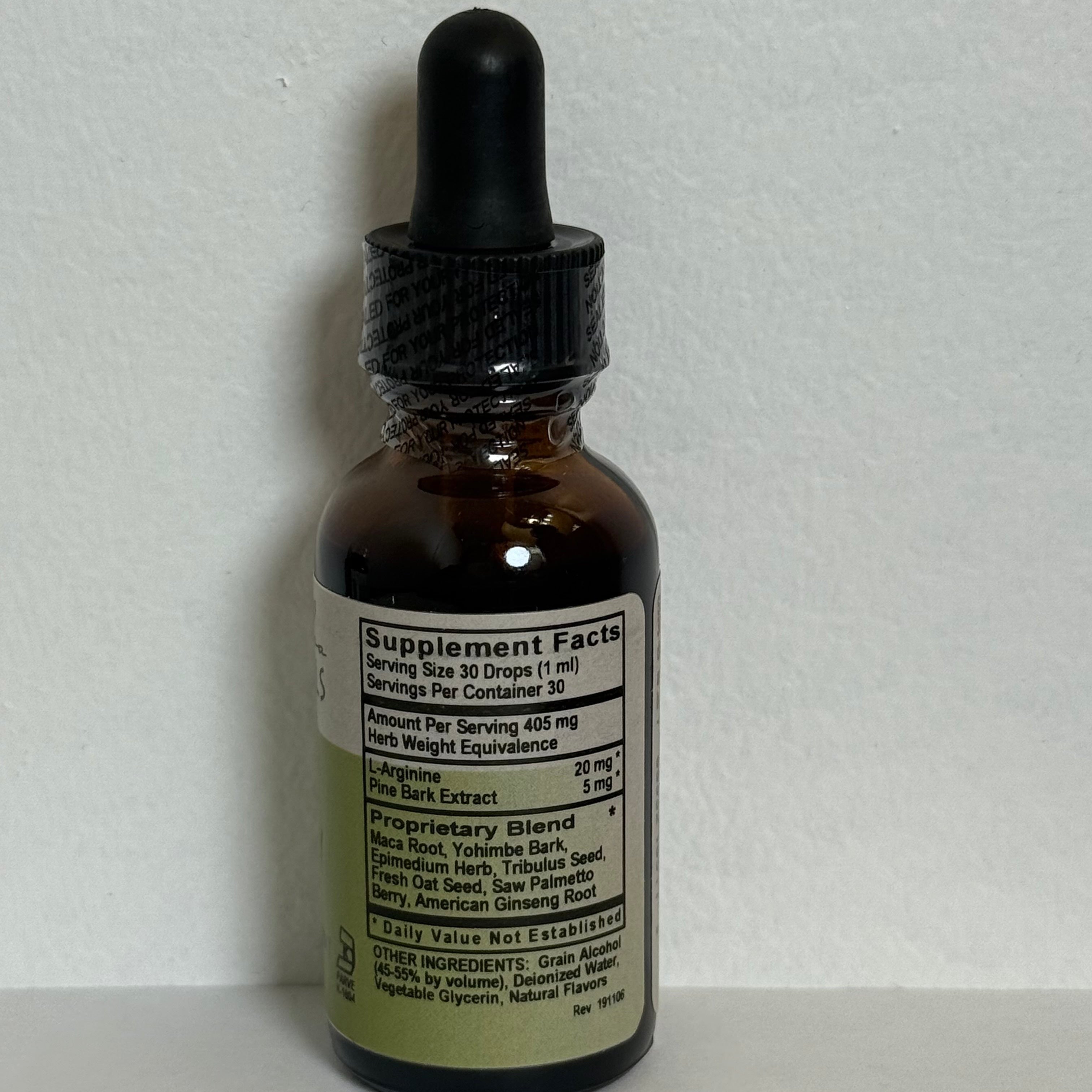 Each 30-drop serving delivers 405mg of herbal extract equivalents along with 60mcg of vitamin B12 (as cyanocobalamin) and 20mg of L-arginine. The formula includes pine bark extract for added antioxidant support and is suspended in a base of grain alcohol (45-55%), vegetable glycerin, and natural flavors for palatability. The liquid delivery system ensures rapid absorption and flexible dosing.